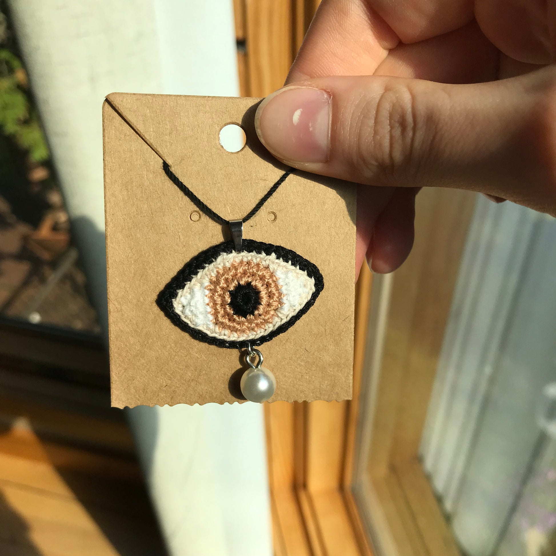 Crochet eye pendant with pearl or glass tear. In the 18th century, lovers would send each other a portrait of their eyes to keep each other close. These lover’s eye pendants are meant to be reminiscent of that romantic trend.