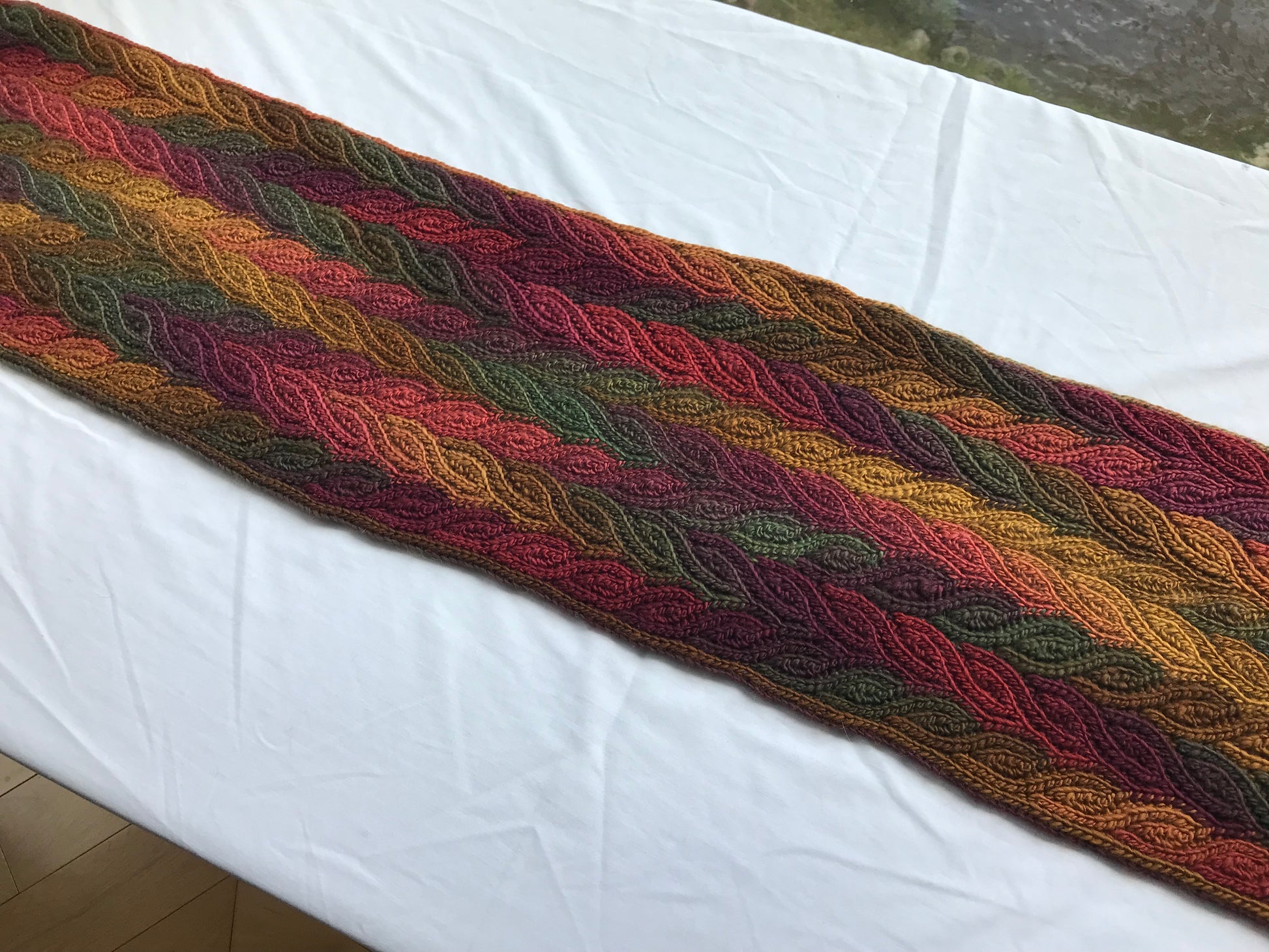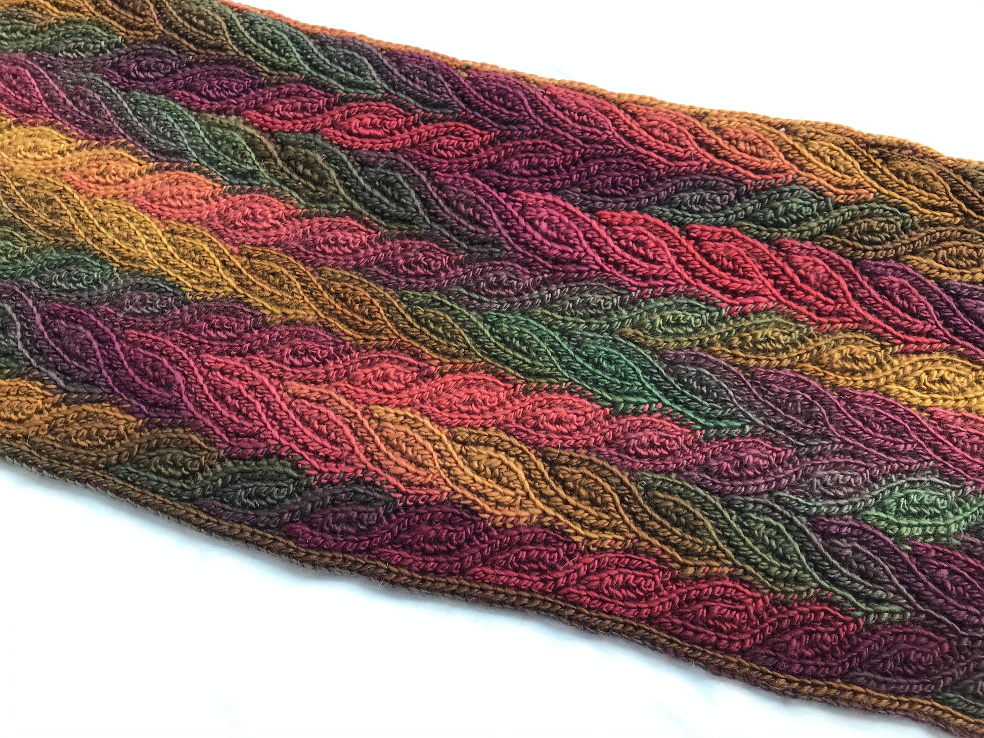 This stole-style shawl is crocheted with a colour changing yarn for a beautiful autumnal effect. With rows of alternating leaves in various shades of greens, reds, yellows, oranges, and purples, this shawl is the perfect accessory for fall. The acrylic yarn also has a soft halo (also called ‘fuzzy’) and will need special care.