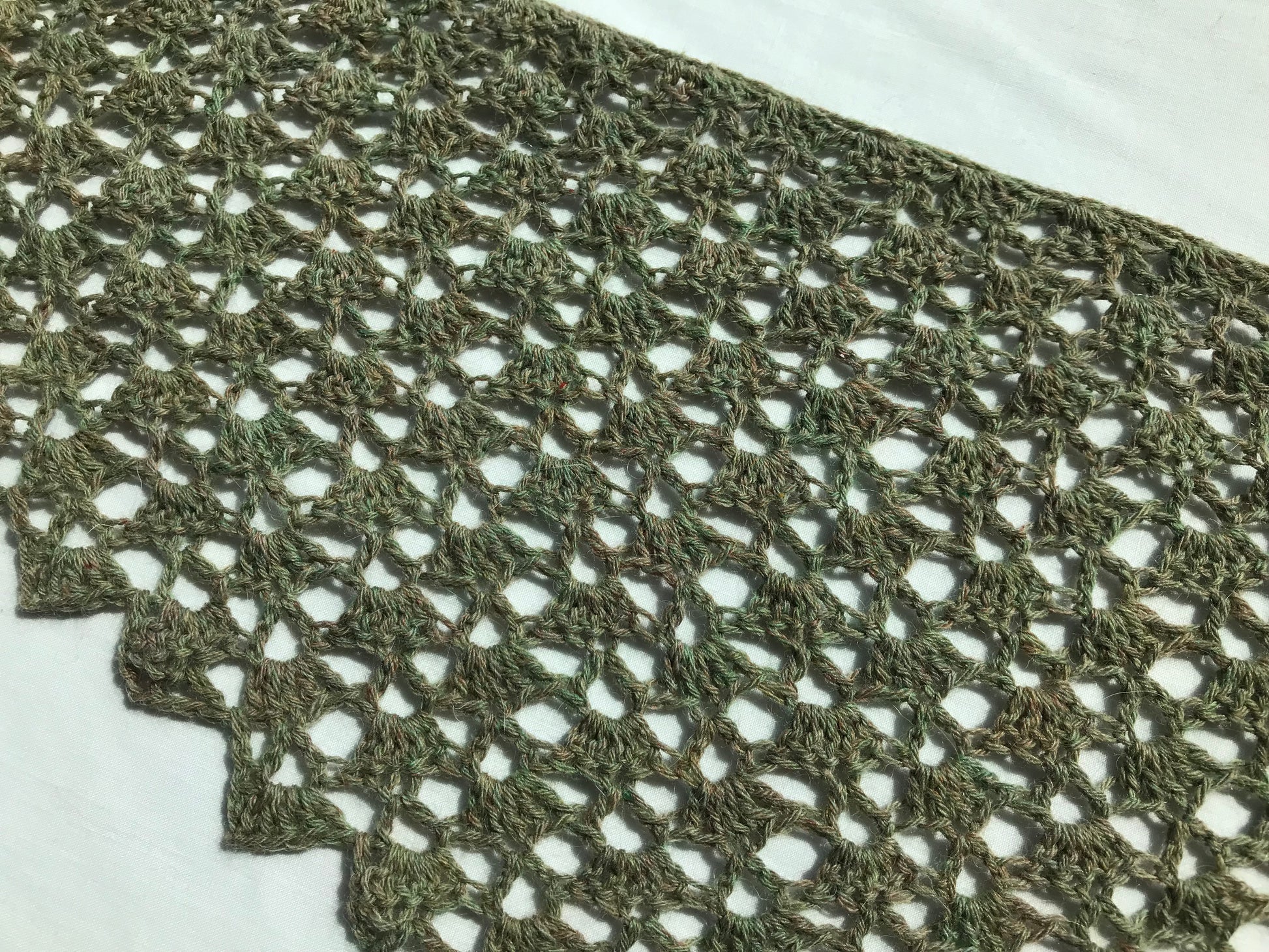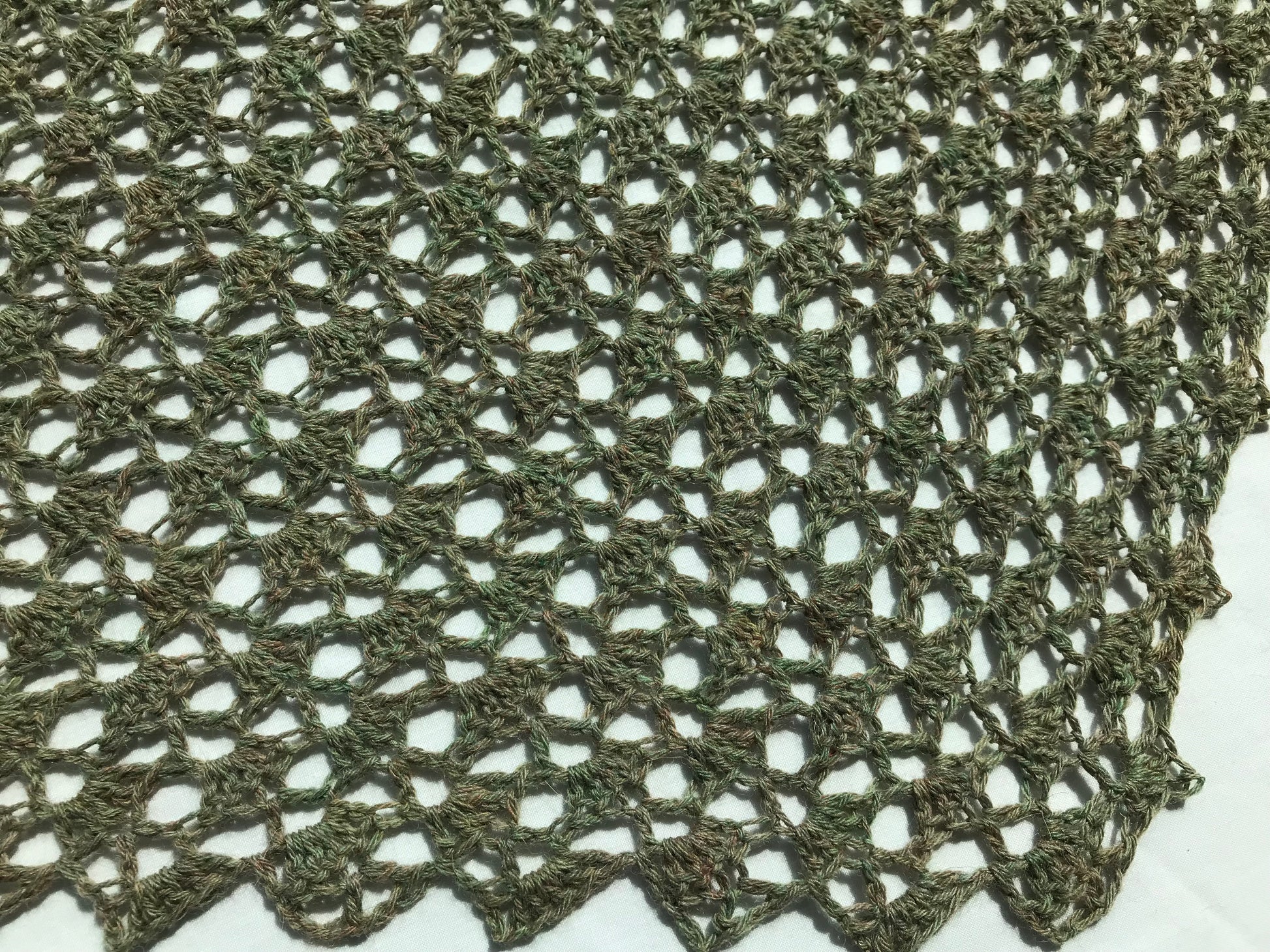 This shawl is made with a very open and lacy stitch pattern, making it suitable for something to wear in warmer months. The yarn is a muted grey-green with a pink undertone and there are two scalloped edges.