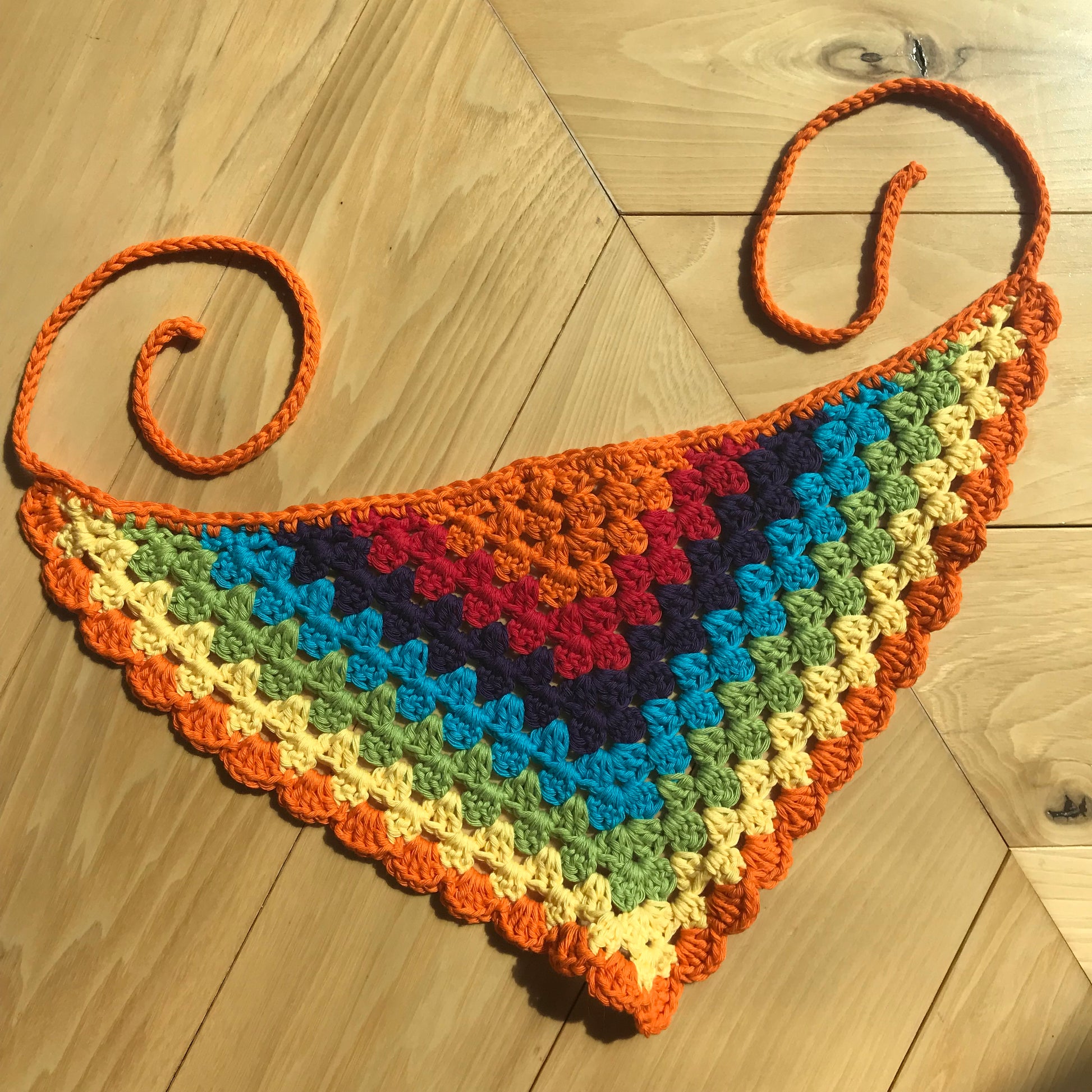 This bandana has a classic crocheted granny square design with a slightly ruffled, scalloped edge. Created to show off your pride in a brilliant 6 colour rainbow, this bandana can also suit anyone who loves vibrant and eye-catching accessories.
